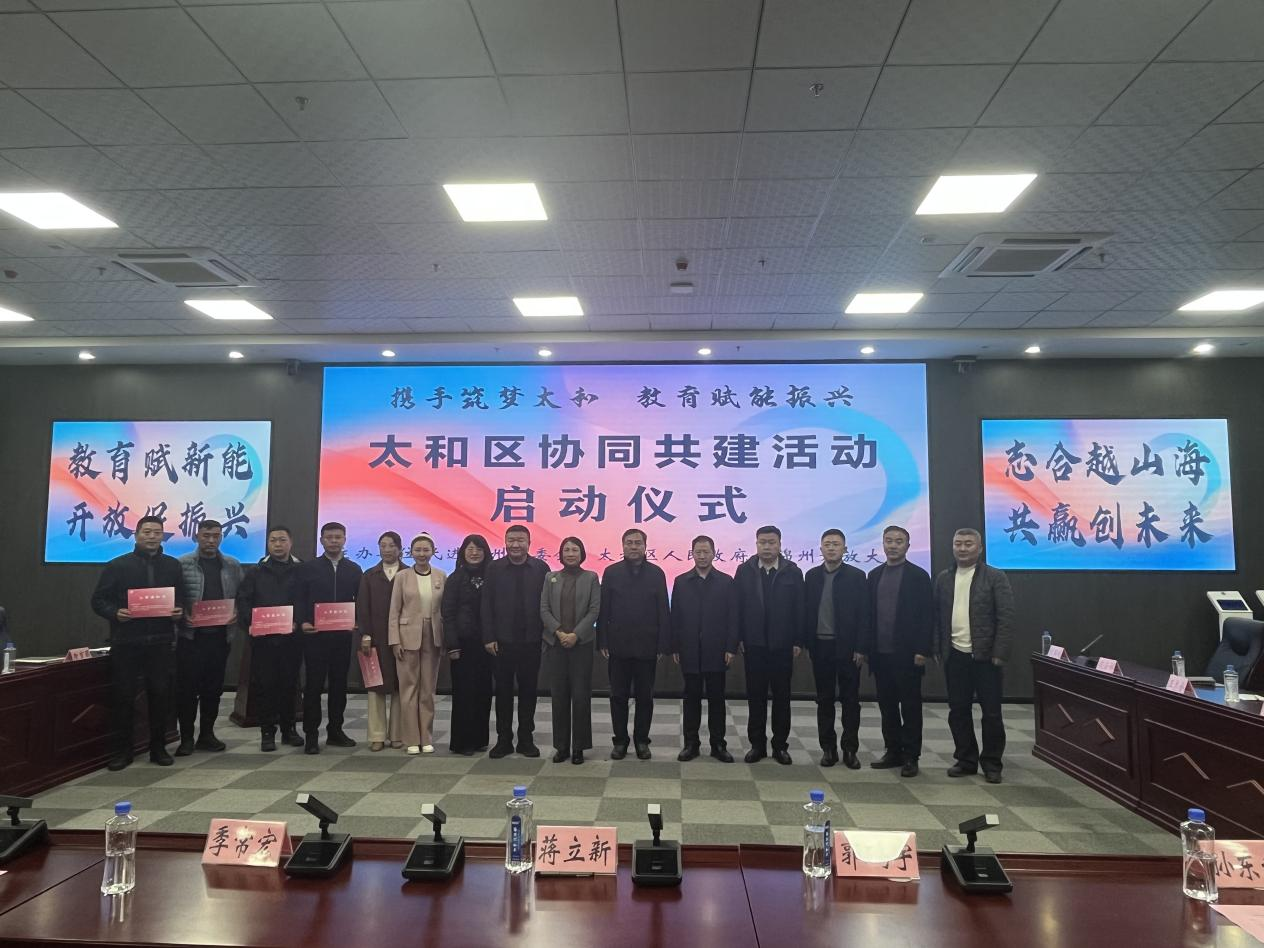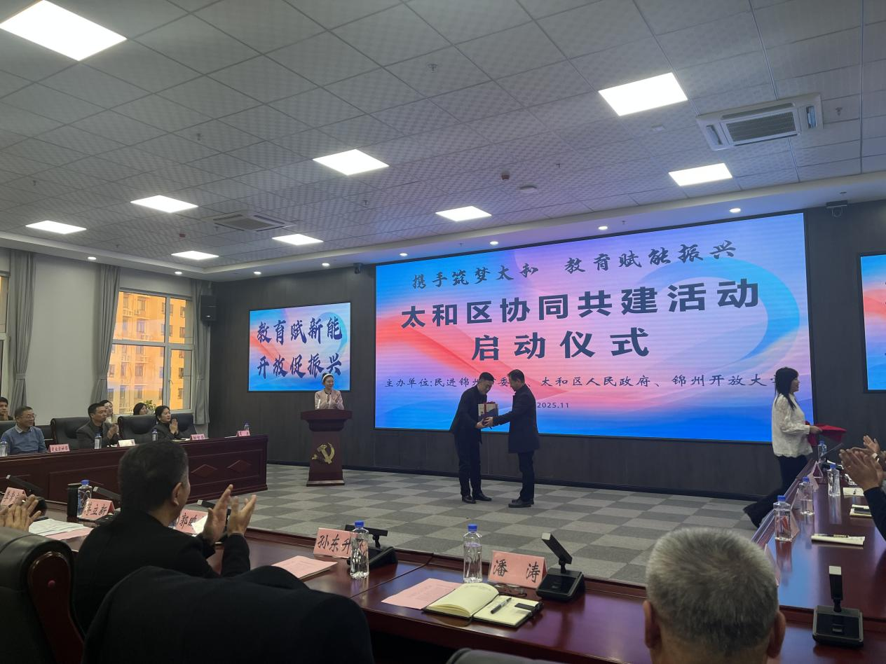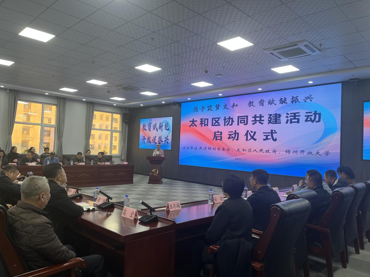 11月18日下午,太和区党群服务中心多媒体会议厅内气氛庄重热烈。由民进锦州市委会、太和区人民政府、锦州开放大学联合主办的“携手共筑太和 教育赋能振兴”乡村振兴协同共建活动启动仪式在此正式举行。锦州市人民政府副市长 民进锦州市委会主委蒋立新,太和区人民政府区长郭鹏宇,辽宁开放大学乡村振兴学院院长季常宏、锦州市教育局副局长任宝国、民进锦州市委会专职副主委常德有、太和区人民政府副区长潘涛、锦州开放大学党委书记韩智玲、校长孙东升等领导嘉宾出席本次活动,由太和区人民政府副区长夏熙主持,共同推动校地、党派协同助力乡村振兴落地见效。