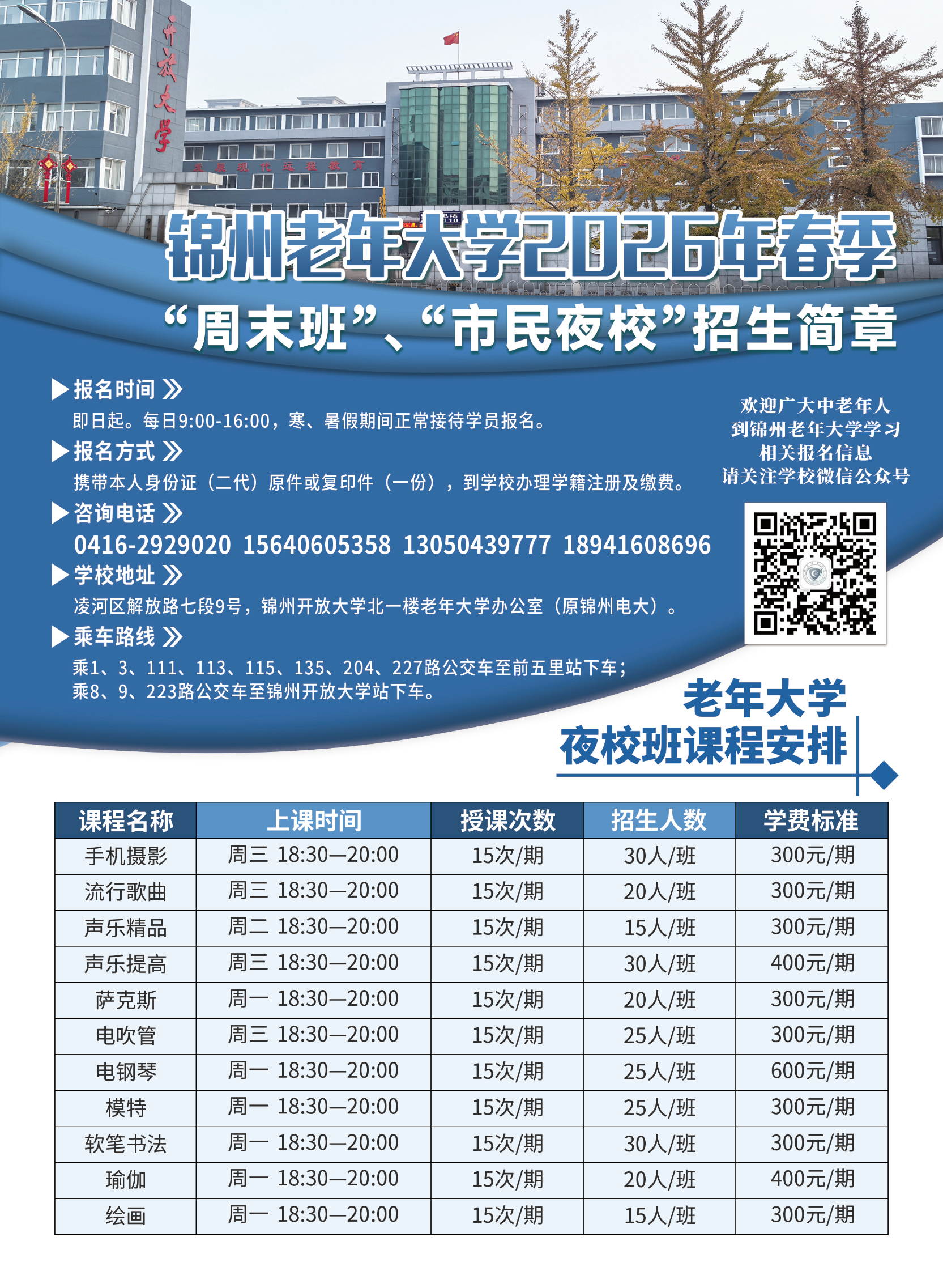 锦州老年大学2026年春季“周末班”“市民夜校”招生简章